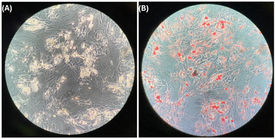 Differentiated adipocytes in vitro: (A) characteristic image of preadipocytes differentiated to adipocytes in vitro and (B) stain of lipid drop of adipocytes with oil red.