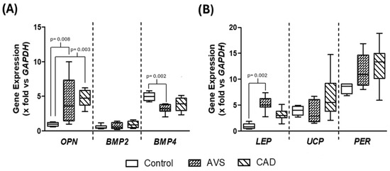 Levels of mRNA of (A) genes related to calcification and (B) characteristic genes of adipose tissue. Primary cultures of in vitro differentiated adipocytes were incubated in the absence of HDL (control) or stimulated for 8 h with HDL isolated from patients with CAD or AVS. Relative mRNA expression was quantified by qPCR and normalized by the GAPDH gene expression. AVS: aortic valve stenosis; CAD: coronary artery disease; OPN: osteopontin; BMP2: bone morphogenetic protein-2; BMP4: bone morphogenetic protein-4; LEP: leptin; UCP: uncoupling protein-1; PER: perilipin-2; GAPDH: glyceraldehyde-3-phosphate dehydrogenase. Data are expressed as median and interquartile range. Groups were compared by a Kruskal–Wallis test; individual p-values were calculated by a Mann–Whitney U-test.
