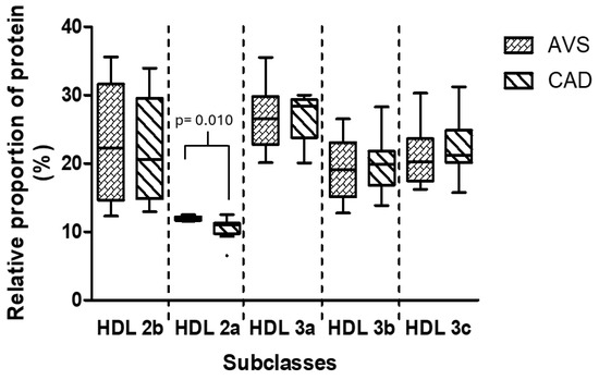 Relative proportion of HDL subclasses as a function of the content of total protein. AVS: aortic valve stenosis; CAD: coronary artery disease; HDL: high-density lipoproteins. Data are shown as the median and interquartile range (box and whisker plot). Mann–Whitney U-test.