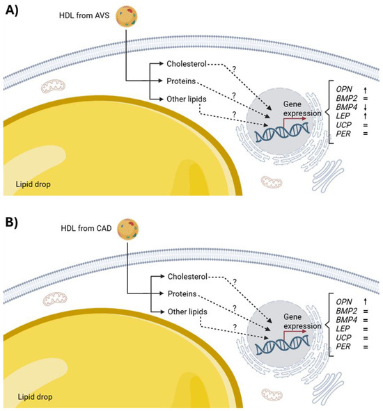 Effect of HDL isolated from AVS patients (A) or CAD patients (B) on the expression of the genes related to tissue calcification (OPN, BMP2, and BMP4) and characteristic genes of the adipocyte phenotype (LEP, UCP, and PER). HDL are internalized into adipocytes (solid lines), and their different components affect gene expression by unknown mechanisms (dotted lines). Differences in the composition and/or structure of the HDL from the AVS or CAD patients are likely the origin of the differential effects on gene expression.