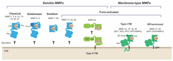 Matrix metalloproteinases (MMPs) can be divided into two subgroups of soluble and membrane-type MMPs. Soluble MMPs can be further classified into Classical, Gelatinases, Smallest, Furin-activated, and Type II-TM MMPs. The typical domain structure contains a prodomain (Pro), a catalytic domain (Cat), a hinge, and a hemopexin domain (Hpx). Gelatinases also contain three repeats of a fibronectin-type II domain insert (FN-II). The smallest MMPs lack the hemopexin domain. Furin-activated MMPs are activated during secretion by proprotein convertases such as furin. Type II-TM MMP-23 is classified as a soluble MMP, as it becomes a soluble enzyme upon intracellular activation by proprotein convertases. Membrane-type MMPs (MT-MMPs) can be classified into Type I-TM and GPI-anchored MT-MMPs. MT-MMPs are activated intracellularly by proprotein convertases. Type I -TM MT-MMPs have an insertion of MT-Loop in the catalytic domain, transmembrane domain, and a short cytosolic tail. GPI-anchored MT-MMPs are anchored to the plasma membrane through a GPI-anchor.