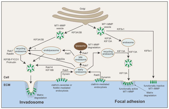 MT1-MMP trafficking to membrane structures. Invadosome: Upon synthesis at the ER and maturation in the Golgi, MT1-MMP is sorted into secretory vesicles. KIF3A and KIF5B were shown to be crucial KIFs for vesicle transport to the invadosome. Protrudin makes contact sites with Rab7 and PI3P–positive late endosomes, containing MT1-MMP. Protrudin hands over Rab7-binding KIF5 adaptor protein FYCO1, enabling the transport of MT1-MMP-containing vesicles along microtubules toward invadopodia. MT1-MMP function on the cell surface is maintained by replacing old MT1-MMP with newly synthesized molecules, and old cell surface MT1-MMP needs to be endocytosed. Flotillin-dependent endocytosis of MT1-MMP into early endosomes, mediated by dynein and Rab5, has been shown to be crucial for invadopodia-mediated matrix degradation. Rab7 further transports MT1-MMP-containing vesicles from the early endosome to late endosomes. Some MT1-MMP is transported to the lysosome for degradation, but some is transported to and stored in endolysosomes without degradation for efficient recycling to endosomes. It is not clear if MT1-MMP in the endolysosome is recycled back to the cell surface through the recycling endosome or directly transported from the endolysosome. It has been shown that Rab14 regulates fast recycling alongside KIF16B, while Rab22a regulates slow recycling through recycling endosomes. It is not clear if these Rab small GTPases are involved in recycling through endolysosomes. Focal adhesion: Upon synthesis at the ER and maturation in the Golgi, MT1-MMP is sorted to secretory vesicles. Both KIF3A and KIF13 are necessary to transport the vesicle to the endosome. From the endosome, KIF13A alone traffics the MT1-MMP-containing vesicles to the focal adhesion. KIF9v1 competes with KIF3A to transport MT1-MMP vesicles to different membrane domains, where MT1-MMP is not functionally active. Clathrin-dependent endocytosis was found to be crucial for MT1-MMP-mediated cell invasion at focal adhesions. Dynamin was shown to play a role in this endocytic pathway. Some endocytosed MT1-MMP can be transported to the endolysosome for degradation, and some is recycled back to the cell surface through the recycling endosome. Rab small GTPases involved in this model of vesicle transport may be the same as those involved in MT1-MMP transport to the invadosome, but this is currently unknown.