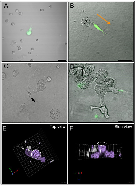 DCIS cells migrate preferentially towards CAFs in MAME co-culture. Representative differential interference contrast/fluorescent overlay image of MCF10.DCIS cells (unlabeled) with CAF40TKi fibroblasts (green) 24 h after seeding (A) and on day 3 (B). Scale bar, 50 µm. Orange arrow indicates migration direction. (C) Video snapshot of live cell imaging between days 3 and 4 shows a tumor spheroid attached to a single fibroblast (Arrow). (D) At day 7, tumor cells have proliferated and formed protruding structures, which are connected to fibroblasts. Scale bar, 100 µm. (E) Representative 3D reconstructed image showing aerial view (E) and side view (F) of MAME MCF10.DCIS:CAF co-culture. A primary MCF10.DCIS spheroid (dashed white circle) can be seen with lateral protrusions towards fibroblasts (CFSE-labeled and pseudo-colored white). Nuclei are stained with DAPI (purple). 1 Unit = 45 microns. Osuala et al., 2015 [36].