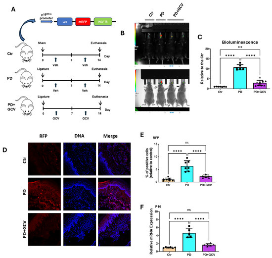 Our previous studies suggested that PD, when combined with advanced age, leads to immune senescence and alveolar bone loss in wild-type C57/B6 mice. Notably, these effects were ablated by the senolytic agent rapamycin [14,38]. Compared with the off-target and pleiotropic effects of rapamycin [39] or other senolytic agents, the p16-3MR mice model enables the selective targeting of senescent cells in periodontal tissues without affecting healthy cells. In the presented study, it was observed that P16-positive cells increased in oral tissues of p16-3MR transgenic mice with PD, as demonstrated through in vivo bioluminescent and fluorescent RFP imaging (Figure 1). Furthermore, treatment with GCV resulted in the selective ablation of senescent cells. This finding was substantiated by qPCR, Western blot analysis, and immunolabeling of senescence (P16, P21, and P53), cellular stress (p-H2a.X), and cell cycle (Cyclin D1) markers (Figure 1 and Figure 2). These findings justify the feasibility of this model in establishing a causative relationship of senescence with PD.