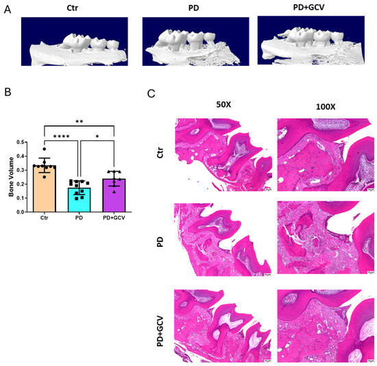(A) Representative 3D micro-CT images of maxillae in the control, PD, and PD+GCV mice. (B) Quantitation of bone volume around 2nd molar N = 9–10/group. (C) Representative hematoxylin–eosin staining of maxillae from control, PD, and PD+GCV mice, N = 6–7/group. Left panel: magnification 50× and right panel: magnification 100×. * Indicates p < 0.05, ** indicates p < 0.01, and **** indicates p < 0.0001.