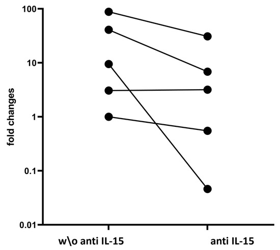 Relative levels of IFN-γ in the surface epithelium (Ep) compartment isolated by LCM from jejunal biopsies cultured ex vivo without (w/o) or with aIL-15 antibody. The biopsies were analyzed by RT-qPCR from the untreated CeD. The fold change represents the relative expression of IFN-γ mRNA normalized to GAPDH. Each point on the plot is representative of a distinct patient (n = 5). The lines link the IFN-γ gene expression of each subject in the two different experimental conditions.