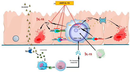 It is well known that the massive intraepithelial infiltration of CD8+ T lymphocytes into the intestinal mucosa of CeD patients has a prominent role in the generation of intestinal villous atrophy. Activation of CD8+ IELs is most likely mediated through IL-15, an inflammatory cytokine that is highly upregulated in duodenal mucosa of untreated CeD patients [19].