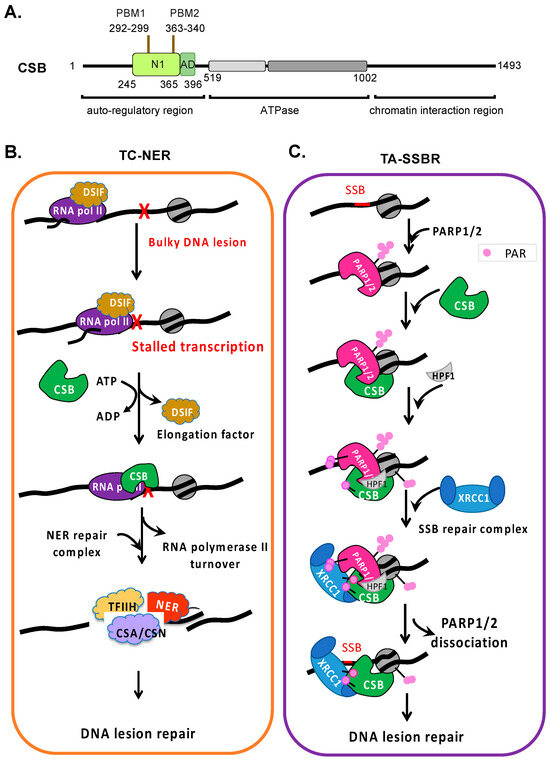 Coupling of NER and SSBR to transcription by CSB. (A) Schematic of CSB’s functional domains. PBM: PARylation binding module. AD: acidic domain. N1: coupling chromatin remodeling to ATPase activity. (B) A minimalized TC-NER model. CSB locates bulky DNA lesion-stalled transcription in an ATP-dependent manner. ATP hydrolysis by CSB is predicted to induce a conformational change that permits stable chromatin association. CSB replaces DSIF, transitioning polymerase II from a transcription elongation complex to a DNA repair complex. CSB is essential for the rapid recruitment of the NER protein as compared to GG-NER. ATP-dependent chromatin remodeling by CSB may enhance the DNA repair efficiency by altering the chromatin environment and stimulating the recruitment of NER proteins. (C) A proposed TA-SSBR model. Single-stranded DNA breaks are detected and bound by PARP1 and PARP2, which activates their enzymatic activity. CSB is then recruited through direct interaction with PARP1 or PARP2, promoting the recruitment of HPF1, which alters the substrate specificity of PARP1 and PARP2, most notably facilitating histone PARylation, which likely promotes chromatin relaxation to facilitate DNA repair. XRCC1-containing SSBR complexes are then rapidly recruited by CSB and PARylated PARP1, PARP2, and histones. CSB may likely facilitate the dissociation of PARP1/2 from DNA breaks to promote the rapid progression of DNA repair in transcribed DNA regions.