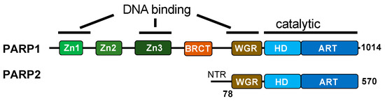 Functional domain comparison between PARP1 and PARP2. PARP1 binds to SSBs with a variety of end chemistries through its zinc fingers and Trp-Gly-Arg (WGR) domain. The zinc fingers are absent in PARP2, which binds primarily to the 5′ phosphate ends of SSBs through its WGR domain and N-terminal region (NTR). The WGR domain, present in both PARP1 and PARP2, is critical in inducing conformational changes and the allosteric regulation of enzymatic activity.