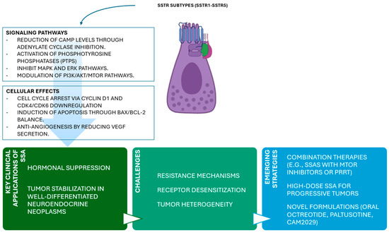 Moreover, the dynamic interactions between tumor cells and stromal components can influence SSTR expression and signaling. For example, certain cytokines and growth factors secreted by stromal cells may downregulate SSTRs or activate alternative proliferative pathways that bypass SSA-mediated inhibition [83]. Understanding these interactions is critical for developing combination therapies that target both the tumor cells and their microenvironment.