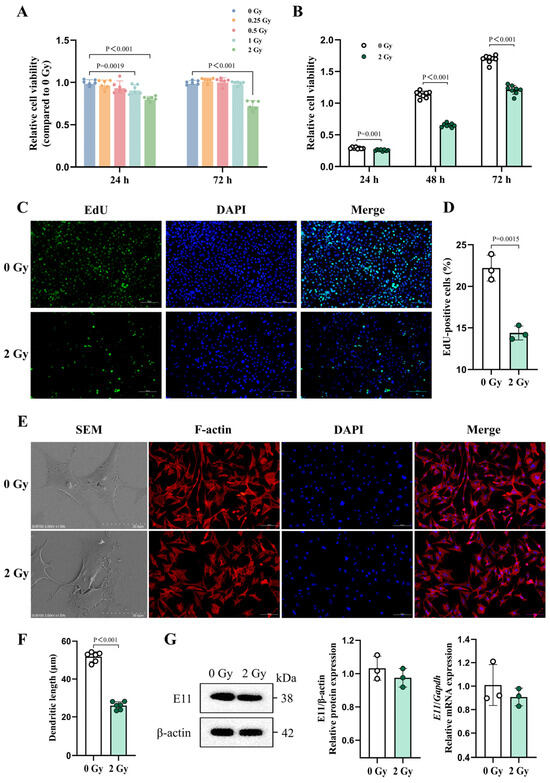 To explore the impact of the radiation dose on the cell viability, primary OCYs were irradiated with dose gradients of 0.25, 0.5, 1, and 2 Gy. The results revealed that the X-rays significantly damaged the cell viability, leading to a dose-dependent decrease in the number of OCYs (Figure 2A). Specifically, the cell viability was significantly reduced by 28.5% after 72 h of 2 Gy irradiation compared with the control group (Figure 2B). Simultaneously, the EdU doping experiments revealed a notable decrease in the OCYs’ proliferation capacity by about 34.8% upon exposure to 2 Gy irradiation (Figure 2C,D and Figures S4 and S5). Furthermore, the SEM and F-actin fluorescence staining uncovered distinct morphological alterations in the irradiated OCYs. A typical mature OCY’s morphology presents as multiple outwardly extending dendrites, while the irradiated OCYs exhibited shortened dendrites, indistinct borders, an altered morphology, and a loss of their dendritic branching structure (Figure 2E and Figures S6–S9). Our quantitative analysis further revealed that the dendritic length of the OCYs was reduced by 48.3% following 2 Gy irradiation (Figure 2F). Notably, E11, a hallmark protein for dendritic formation, showed a downregulated expression in its mRNA and protein levels after 2 Gy irradiation (Figure 2G). In summary, 2 Gy of X-rays can cause cellular morphological changes and biological damage in primary OCYs.