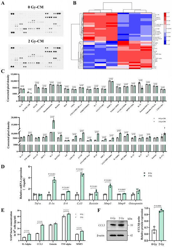 Changes in the secretory phenotype caused by IR-induced senescent OCYs. (A,B) Alterations in SASP profiles in the supernatant of the irradiated OCYs observed using cytokine antibody microarray analysis and clustering heatmap analysis (n = 3). (C) The quantitative expression levels of specific secretome components of the IR-induced senescent OCYs, presented as the corrected pixel density (n = 3). (D) The relative mRNA expression levels of key secretome components of the irradiated OCYs, determined using RT-qPCR (n = 3). (E) The protein concentrations of major SASP factors in the supernatant, determined using an enzyme-linked immunosorbent assay (n = 3). (F) The relative protein expression levels of CCL3, determined using Western blot analysis (n = 3). The data are presented as the mean ± SD, and differences that were not statistically significant are not labelled.