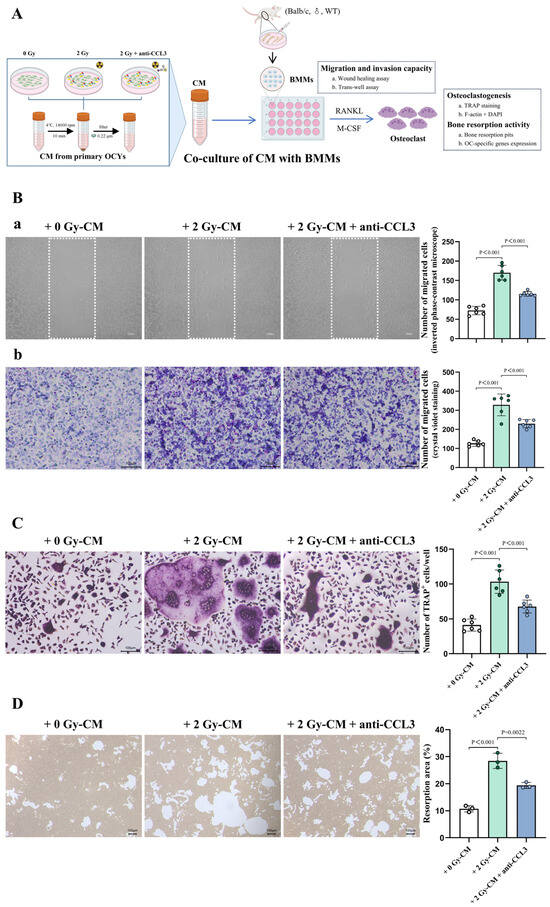 The horizontal migration of OCPs was evaluated using the wound healing scratch assay, while their vertical migration was assessed using a trans-well assay in vitro. For the wound healing assay, the BMMs were seeded into 6-well plates (4 × 105 cells/well) and incubated in a complete medium enriched with 25 ng/mL of M-CSF. After confluence, the cells were treated with mitomycin (1 μg/mL) (M5353; Sigma-Aldrich, St. Louis, MO, USA) for 1 h, and then a straight scratch was made in the cell monolayer using a 200 µL pipet tip, immediately followed by washing and incubation in a serum-free medium containing 50% CM (0 Gy, 2 Gy, or 2 Gy + anti-CCL3). After 24 h of culture, the number of cells that had migrated from the wound edge was quantified. For the trans-well assay, the BMMs (2 × 105 cells/well) were cultured in the upper chamber of a trans-well plate in 200 µL of α-MEM with 25 ng/mL of M-CSF for 48 h and then replenished with serum-free α-MEM. Subsequently, 1 mL of α-MEM containing 50% CM (0 Gy, 2 Gy, or 2 Gy + anti-CCL3) was added into the lower chambers, and cells were incubated for an additional 24 h. Following this, the cells in the lower chamber which had migrated from the upper chamber were fixed with 2.5% glutaraldehyde for 5 min and stained with crystal violet for 10 min. Ten random images per well were captured under a light microscope at 100× magnification, and the average number of stained positive cells was calculated.