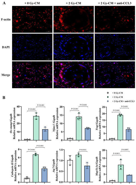 The BMMs were seeded into 96-well plates (2 × 104 cells/well) and incubated in a complete medium enriched with 25 ng/mL of M-CSF for 72 h. Subsequently, the medium was substituted with an osteoclast induction-conditioned medium consisting of 50% CM (0 Gy, 2 Gy, or 2 Gy + anti-CCL3) and was further fortified with 25 ng/mL of M-CSF and 10 ng/mL of receptor activator of nuclear factor kappa-B ligand (RANKL) (315-11; Peprotech, Rocky Hill, NJ, USA). After a 4–5 day induction phase, the osteoclasts were immobilized and stained using the TRAP kit (387A-1KT; Sigma-Aldrich, St. Louis, MO, USA) according to the manufacturer’s guidelines. Cells with positive TRAP staining and more than 5 nuclei were enumerated as osteoclasts.
