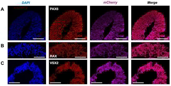 Retinal progenitors in Crx-GFP;Rax-mCherry-derived retinal organoids. (A) Anti-VSX2 labeling at day 9 (D9). (B) Anti-RAX labeling at day 9 (D9). (C) Anti-PAX6 labeling at day 9 (D9). Scale bar—50 µm.