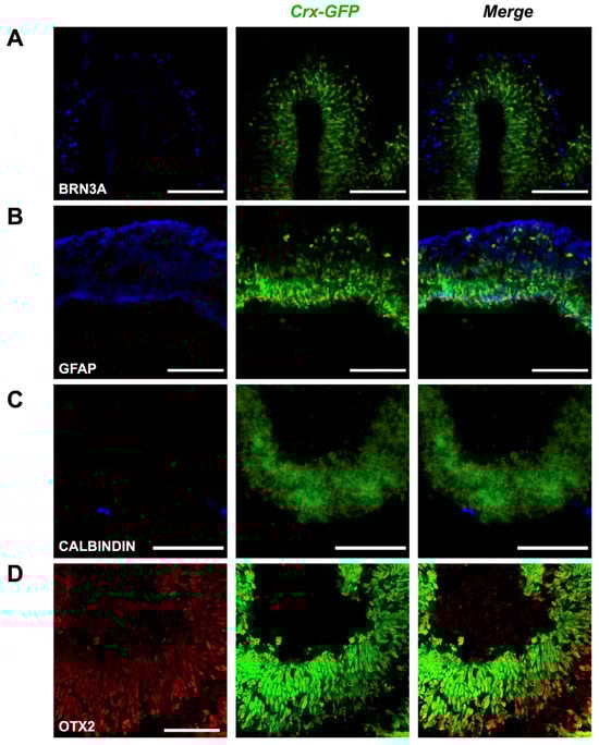 Next, we expected to observe the formation of all main cell types by days 17–18, assuming the developmental rate in vitro to be similar to the in vivo situation. We therefore collected organoids aged between 17 and 25 days to label different retinal cell types. Staining of BRN3A (blue) marked a dispersed population of retinal ganglion cells of the evaginated optic vesicle (Figure 5A); reactivity to GFAP (blue) in the same region labeled an outer foot of Müller glia cells (Figure 5B); scant potential amacrine and horizontal cells appeared with anti-Calbindin staining (blue, Figure 5C), and sparse bipolar cells were visualized with OTX2 labeling (red, Figure 5D). The green labeling corresponds to the GFP expression controlled by Crx inherent to cone and rod photoreceptor cells. These results show that our gene editing approach did not alter the potency of pluripotent stem cells to generate retinal organoids containing the different retinal cell types. The activity of retinal progenitor cells at different retinal developmental stages is also revealed, as well as their ability to proliferate (extension of the mCherry-positive cell population during early time points) and differentiate into all main retinal types.