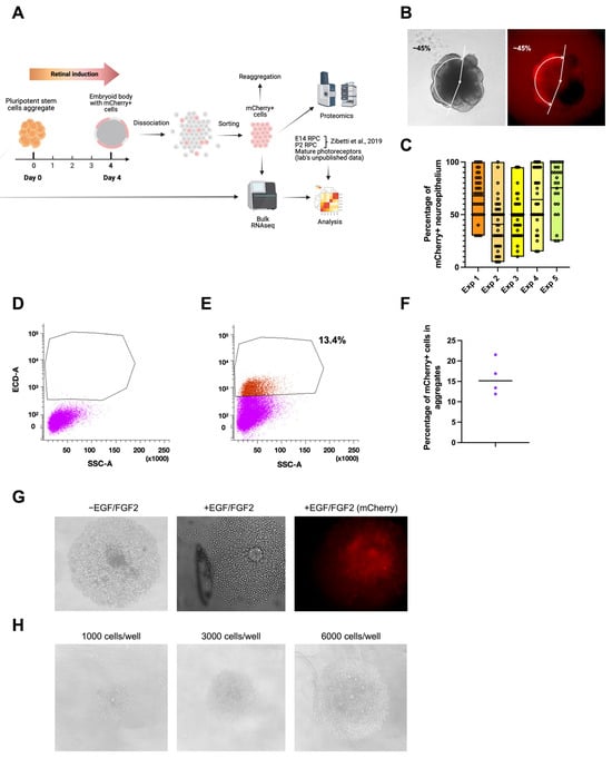 Isolation and analysis of mCherry-positive cells from day 4 mouse retinal organoids. (A) Scheme of the mCherry-positive cell isolation and analysis. (B) Estimation of mCherry+ part of neuroepithelium in day 4 (D4) embryoid body. (C) Part of mCherry+ neuroepithelium in Crx-GFP;Rax-mCherry stem cell line-derived aggregates in 5 experiments (Exp. 1, n = 40; Exp. 2, n = 40; Exp. 3, n = 37; Exp. 4, n = 40, Exp. 5, n = 26). (D) Negative control cells from Crx-GFP-derived stem cell aggregates. (E) The population of sorted mCherry+ cells from dissociated Crx-GFP;Rax-mCherry stem cell line-derived aggregates. (F) Part of mCherry+ cells in FACS-analyzed aggregates in 4 experiments. (G) Aggregation of mCherry+ cells with and without growth factors EGF and FGF2 in a 96-well plate with a U-shape bottom and low-adhesion surface. (H) Aggregation of mCherry+ cells with different cell densities [27].