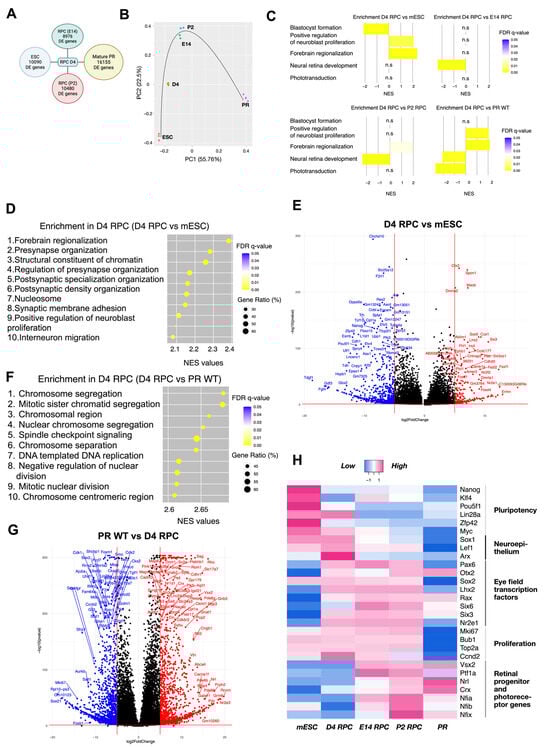 Transcriptomic analysis of day 4 mCherry-positive cells from mouse retinal organoids. (A) Number of differentially expressed genes with adjusted p-value less than 0.05 in D4 RPC compared to mESC, E14, P2 RPC, and wild-type mature PR. (B) Principal component analysis of mESC, D4 RPC, E14 RPC, P2 RPC, and wild-type mature PR. The black line indicates the approximate developmental trajectory. (C) Enrichment of 5 selected gene sets in D4 RPC compared to mESC, E14 RPC, P2 RPC, and wild-type mature PR. NES—normalized enrichment score, gene sets enriched in D4 RPC have positive NES, and gene sets enriched in another group have negative NES. (D) Top 10 enriched gene sets in comparison “D4 RPC versus mESC”. Gene ratio indicates the number of genes of the leading edge subset that actively contribute to the enrichment score. (E) Volcano plots for differentially expressed genes of Crx-GFP;Rax-mCherry D4 RPC compared to mouse embryonic stem cells. (F) Top 10 enriched gene sets in comparison “D4 RPC versus WT PR”. (G) Volcano plots for differentially expressed genes of Crx-GFP;Rax-mCherry D4 RPC compared to mouse wild-type mature PR. (H) Heatmap of gene expression in mESC, D4 RPC, E14 RPC, P2 RPC, and wild-type mature PR. Selected genes are grouped into five categories. mESC—mouse embryonic stem cells, RPC—retinal progenitor cells, PR—photoreceptors. n.s.: non-significant.