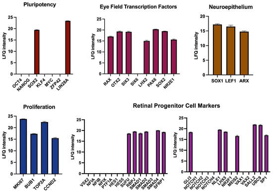 Finally, we aimed to support our findings from transcriptomic data with a proteomic study of D4 RPCs (Figure 8). Protein content data obtained by liquid chromatography with tandem mass spectrometry confirmed the presence of 2 out of the 7 major pluripotency regulators (SOX2 and LIN28A) as observed at the RNA level. SOX2 is necessary for neural and eye induction and is present in early progenitors [52]. The high expression of LIN28A in early progenitors was reported at a stage as early as E12 for mouse retina [54]. All EFTFs seen at the RNA level were also detected at the protein level (RAX, OTX2, SIX3, SOX2, LHX2, PAX6, and NR2E1), as well as proliferation and neuroepithelium regulators. Among the retinal progenitor genes, some critical RPC proliferation and differentiation proteins were present (RBPJ, SMAD proteins, and MEIS2), while some others, notably VSX2, NFI factors, HES1, HES5, and NOTCH receptors, were not detected. In conclusion, the protein composition of D4 RPCs confirms their early commitment to retinal progenitor cells.