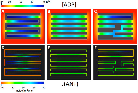 ANT flux inside cristae mirrors ADP depletion. Results of computer simulations of mitochondrial ATP synthesis for inner membrane spatial models with uniform unbranched cristae connected to the inner boundary membrane by crista junctions at one end (A,D) or both ends (B,E); and for spatial models with cristae that vary in branching and crista junction distribution (C,F). Upper frames are maps of ADP concentrations inside cristae and in the cytosol. Lower frames are maps of the flux of the Adenine Nucleotide Translocator (ANT) on the inner membrane surface. Cytosolic [ADP] is set to 0.037 mM on the outer boundary. Cristae are 20 nm wide, spaced 20 nm apart in the uniform models. Vertical and horizontal directions are rendered at different scales in the maps: vertical and horizontal boundaries are 0.30 and 0.76 μm long, respectively.