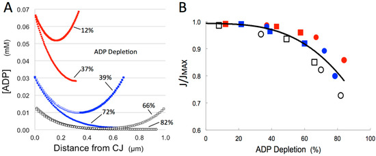 Impact of intracristal ADP depletion on flux of ATP synthase. Results of computer simulations of mitochondrial ATP synthesis for inner membrane spatial models with uniform unbranched cristae as in Figure 1A,B. Symbols in the curves correspond to cristae connected to the inner boundary membrane by crista junctions at one end (circles) or both ends (squares), color-coded by cytosolic ADP levels of 0.074 mM (red solid), 0.037 mM (blue solid), and 0.0185 mM (black open symbols). (A) Representative plots of intracristal ADP gradients as a function of distance from CJ openings for varying crista lengths (0.32, 0.64, 0.96 μm, as indicated by the extent of the curves). Intracristal ADP depletion is indicated for each condition, calculated in terms of the areas under each curve. (B) Plot of the variation in flux of ATP synthase, J, measured relative to the flux in models absent cristae, JMAX, for the entire data set (18 conditions). Crista lengths increase from left to right for each set of three identical symbols.