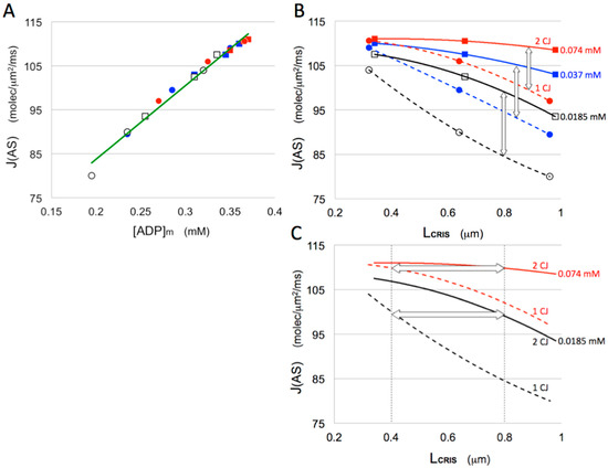 Note that this analysis of the modulation of J(AS) by inner membrane topology is based on the dependence of J/JMAX on LCRIS (crista length) in Figure 4, which plots fluxes of ATP synthase supported by uptake of ADP into the matrix via intracristal ANT. This ignores the contribution to J(AS) by ANT activity outside cristae on the IBM, which is unaffected by restrictions to ADP diffusion related to crista size and connectivity to the IBM. Assuming uniform distribution of ANT along the IM surface, the fraction of ANT on the IBM relative to those inside cristae is small for mitochondria with densely packed cristae—only 8% in the case of the cardiomyocyte mitochondrion—since crista membranes account for 92% of the IM surface area. Inclusion of an IBM term in Equation (6) increases J/JMAX from 0.58 to 0.61 for detached cristae, from 0.70 to 0.72 for the observed IM topology, and from 0.93 to 0.94 for maximum crista connectivity to the IBM.