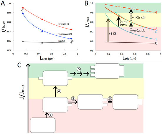Figure 4B is a schematic summarizing the predictions from the computer simulations, and Figure 4C is a cartoon illustrating the corresponding changes in crista topology. Fluxes of ATP synthase (relative to that in the absence of diffusion restrictions, JMAX) can be considered to fall into three “speed zones”: fast (green) for flux ≥ 0.9 × JMAX, moderate (yellow) for flux = (0.9 − 0.75) × JMAX, and slow (red) for flux < 0.75 × JMAX. Detached cristae operate at about 0.6 × Jmax (solid black line). Connecting a crista to the IBM at a single narrow CJ (solid blue curve) improves matters a bit: fluxes move from red into the yellow zone for short cristae, but drop back into the red zone as lengths approach 0.4 μm. Increasing the width of the CJ opening from 20 nm to 150 nm (the width of the crista) improves matters considerably (solid red curve), keeping fluxes in the yellow zone until lengths reach ~0.8 μm. Note that widening one CJ opening is equivalent to adding multiple (n) narrow (20 nm wide) CJs to the same (cis) side of the cristae, where n = 1 to 6. It turns out that the gain in flux from maximizing diffusion at one end of a crista is equivalent to adding a second narrow CJ at the trans side (dashed blue curve). In order to keep the rate of ATP synthesis in or near the “fast” zone across the full range of crista lengths, diffusion bottlenecks have to be minimized at both ends of cristae (dashed red curve).