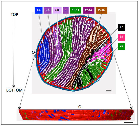 An overhead view of the membrane surfaces within the reconstructed region of this mitochondrion (a slab ~130 nm thick) is provided in Figure 5. While there appear to be over 30 crista profiles in this view, 3-D analysis indicates there are 19 unique cristae not interconnected within the section, numbered C1–19 from point “O” on the IBM. The color-coding of cristae in the model reflects regions of interest selected during the image analysis process (see Methods), which was influenced by visual impressions of crista shape and orientation. As noted above, there is a marked polarity in membrane morphology from left to right in Figure 5, with cristae in the left two-thirds of the mitochondrion (C1–16) having predominantly lamellar morphology and those at right (C17–19) displaying more tubular shapes.