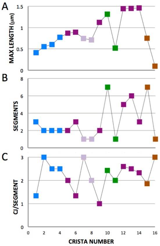 With a few exceptions, there is a progressive increase in length of cristae C1–16 (measured as the longest membrane contour in each crista) from 0.41 to 1.46 μm (Figure 6A), with C15 decreasing in length as the cross-section width drops below 1 μm. The zoomed-in view of cristae C2–7 in Figure 7A reveals that C6 is branched, with a single bifurcation to form a Y-shaped compartment. Only one other crista in C1–9 has a similar branch (C1), with the rest unbranched. By contrast, five of the next seven cristae (C10–16) are branched, shown in detail in Figure 8. In four of these cristae (C10, C12, C13, C15), the observed branching is complex, with multiple bifurcations into Y, Ψ, and X patterns at one or both ends. In a few cases lamellar crista segments are interconnected by short transverse tubular segments, as indicated in the branching patterns of Figure 8. Figure 6B is a plot of crista branching, scored as number of segments, for the 16 cristae. (For this purpose, a segment is defined as a crista subregion that extends to the IBM. Thus, an unbranched crista may have one or two segments depending on whether one or both ends span the mitochondrial cross section). Comparison of the data in Figure 6A,B indicates a strong correlation of crista branching with crista length: five of the seven branched cristae are longer than 0.8 μm, and three of the four multi-branched cristae are longer than 1.3 μm.