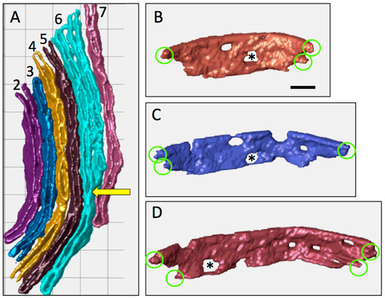 Variations in topology of cristae C2–7. (A) In this rendering, the crista compartments are unsealed and IBM and OM are not shown. Color-coding of surfaces does not follow that of Figure 5. The single Y-type branch in C6 is indicated by an arrow. Note the short length of C7, which is one of the few cristae that do not extend to both “top” and “bottom” sides of the IBM. The grid has 50 nm spacings. (B–D) Side views of cristae C3–5 rendered as sealed compartments as in Figure 5, showing numerous randomly distributed fenestrations (one marked by * in each crista) and typical protruding crista junctions encircled. Surfaces are colored differently than in (A). The scale bar in (B) is 50 nm.
