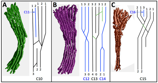 Branching patterns and CJ distribution in cristae C10–16. The branching patterns for each lamellar crista in the clusters (A) C10–11, (B) C12–14, and (C) C15–16 are provided along with the number of CJs on the individual segments. Color-coding of the branching patterns for adjacent cristae alternates between black and blue to avoid confusion. Green lines indicate tubular regions. Lengths of the lines in the branching patterns are only approximate.