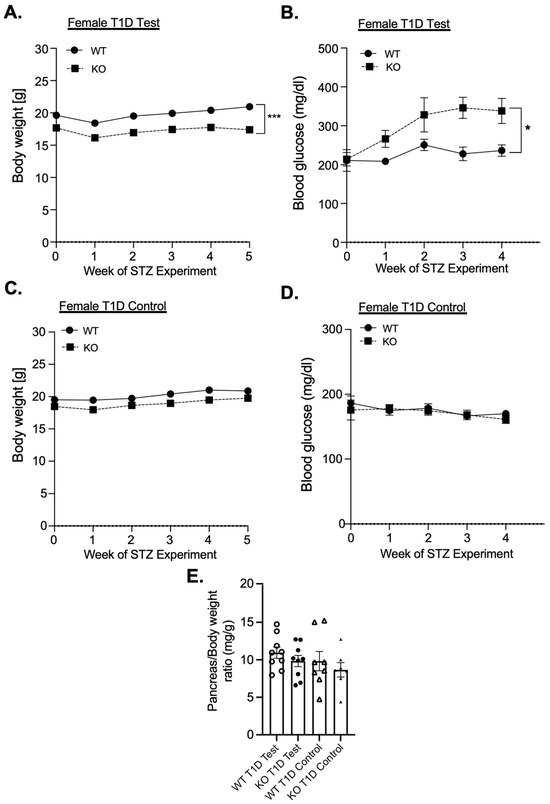 Body weight and blood glucose levels in female MKP-2-deficient mice in STZ T1D test. Weight curves of STZ T1D test (A) and control (C), blood glucose of STZ T1D test (B) and control (D), and pancreas weight (E) of MKP-2 WT and KO mice (n = 8–9 mice/genotype). Results represent the mean ± SEM; *: p < 0.05, ***: p < 0.0001 as determined by analysis of variance (ANOVA) with Bonferroni’s post-test for multiple comparisons.