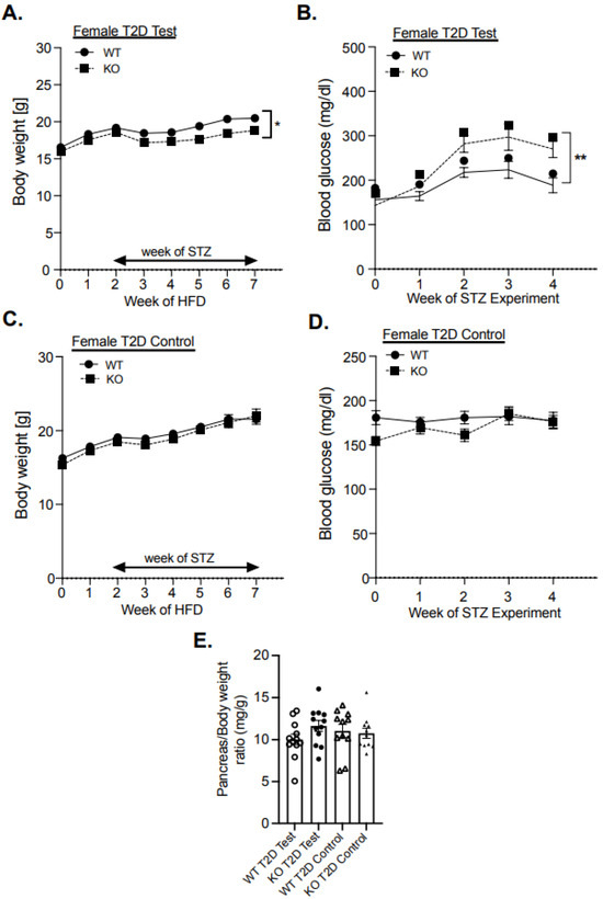 Body weight and blood glucose levels in female MKP-2-deficient mice in STZ T2D test. Weight curves of STZ T2D test (A) and control (C), blood glucose of STZ T2D test (B) and control (D), and pancreas weight (E) of MKP-2 WT and KO mice (n = 11–12 mice/genotype). Results represent the mean ± SEM; *: p < 0.05, **: p < 0.01, as determined by analysis of variance (ANOVA) with Bonferroni’s post-test for multiple comparisons.