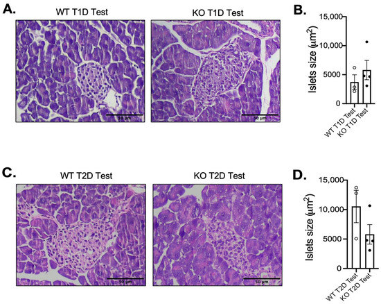 Given that the development of diabetes is largely dependent on the maintenance of pancreatic islet function, we performed hematoxylin and eosin (H&E) staining of pancreatic islets from MKP-2 WT and KO T1D and T2D models. In the T1D model, H&E analysis of pancreatic islets demonstrated an increase in islet size in STZ-treated female MKP-2 KO mice that is not statistically bigger than that of the MKP-2 WT mice (Figure 3A,B). However, in the T2D model, the size of the pancreatic islets revealed by H&E analysis tended to be smaller in the STZ-treated female MKP-2 KO mice compared to the MKP-2 WT mice (Figure 3C,D). In both T1D and T2D, both sexes and genotypes exhibit comparable pancreas weight in the STZ-treated and control mice (Figure 1E and Figure 2E). The decrease in islet size may constitute STZ-damaged cells that lost their ability to secrete insulin in response to glucose, suggesting that MKP-2 activation in the islet cells can preserve them from cell death caused by STZ. These results suggest that MKP-2 activation may help improve islet size in T2D in females.
