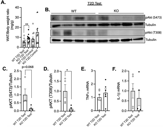 We then considered whether impaired metabolic flux in peripheral tissues would be consistent with hyperglycemia and dysfunctional pancreas. Adipose tissue dysfunction promotes insulin resistance and impaired pancreatic islet dysfunction in T2D [45]. The finding that female MKP-2 KO mice show markedly enhanced adipose tissue mass under STZ-treated conditions compared with that for wild-type controls initially provided supporting evidence that the loss of MKP-2 could affect adipose tissue metabolism (Figure 5A). However, control female MKP-2 WT and KO mice exhibit comparable adipose tissue mass (Figure 5A). We next measured the phosphorylation status of Akt in the white adipose tissue (WAT) of STZ-treated female MKP-2 KO mice. The phosphorylation of Akt Ser473 was also decreased but not statistically lower than that of wild-type mice (Figure 5B,C). We found that in the WAT of female MKP-2 KO mice, Akt Thr308 phosphorylation was significantly reduced compared with MKP-2 WT mice (Figure 5B,D). These data demonstrate that in STZ-induced T2D, MKP-2 deletion results in reduced Akt activation that is associated with increased adiposity and insulin resistance in female MKP-2 KO mice. Along with cellular growth, survival, and apoptosis prevention, the Akt signaling pathway is a crucial regulator of islet cell function [46,47]. In the diabetic state produced by STZ injection, there was a decrease in Akt phosphorylation during rat placental development [48]. Diabetic muscle atrophy has also been linked to the inhibition of AKT signaling [49]. Consequently, our research indicates that inhibition of MKP-2 and downregulation of Akt signaling may be key mechanisms in STZ-induced hyperglycemia and diabetes. Next, we sought to determine the effects of inflammation on the development of insulin resistance in adipose tissue. The gene expression analysis of key inflammatory genes showed comparable levels of levels of TNFα and IL-1β in STZ-treated female MKP-2 KO mice and wild-type controls (Figure 5E,F).