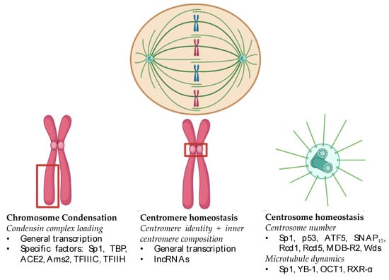 Transcription factors were long believed to be evicted from mitotic chromatin. During mitosis, the chromosomes condense, and transcriptional programs were thought to cease [48,49]. Additionally, the conformation of mitotic chromosomes changes and the long-range enhancer–promoter contacts are eliminated [50]. Further, individual transcription factors were also mostly demonstrated to be evicted from the chromatin. One of the earliest studies that described this phenomenon determined that the ubiquitously expressed mammalian transcription factor Sp1 is removed from the hsp70 gene promoter [51]. Later studies confirmed that both specific transcription factors and components of the basal transcriptional machinery were removed from mitotic chromosomes [52]. Therefore, transcription factors were believed to have little direct role in mitotic progression due to the changes in the chromatin state, the cessation of transcription, and the removal of transcription factors from their promoters.