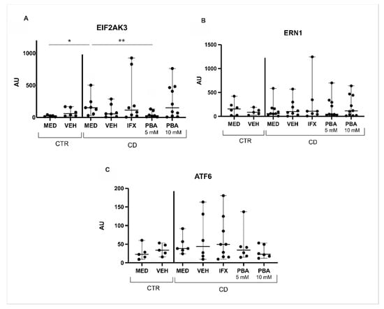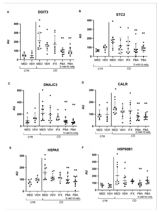 3.3. Chaperones and Genes Responsive to UPR Were Blocked with PBA in the Intestinal Mucosa of Crohn’s Disease Patients