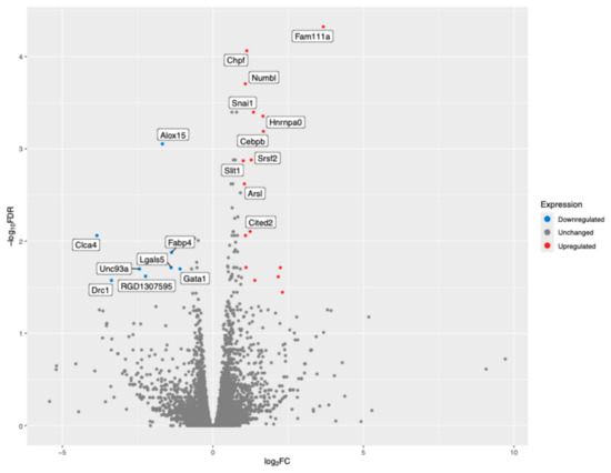 | Clca4 | chloride channel accessory 4 | −3.85 | 8.70 × 10−3 |