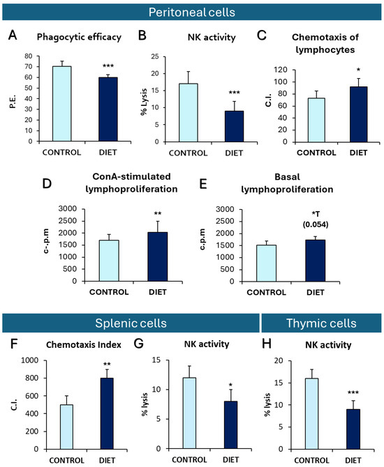 Immune function parameters. In peritoneal cells: (A) Phagocytic efficacy (P.E.), (B) Natural killer (NK) activity (% lysis), (C) chemotaxis index (C.I.) of lymphocytes, (D) ConA-stimulated lymphoproliferation (counts per minute or c.p.m) and (E) Basal lymphoproliferation (c.p.m). In spleen leukocytes: (F) chemotaxis index (C.I.) and (G) NK activity (% lysis). In thymic leukocytes: (H) NK activity (% lysis). Each column shows as mean ± standard deviation. The statistical analysis used was unpaired t-student *: p < 0.05; **: p < 0.01 and *** p < 0.001 with respect to the values obtained in control animals. *T: statistical trend.