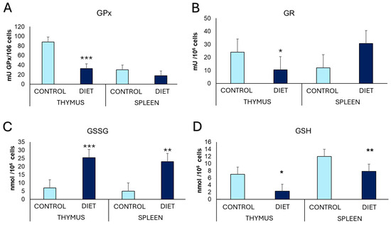 Oxidative state parameters evaluated in splenic and thymic leukocytes. (A) Glutathione peroxidase (GPx) activity in mU/106 cells, (B) Glutathione reductase (GR) activity in mU/106 cells, (C) Oxidized glutathione (GSSG) in nmol/106 cells, and (D) Reduced glutathione (GSH) in nmol/106 cells. Each column shows as mean ± standard deviation. The statistical analysis used was unpaired t-student *: p < 0.05; **: p < 0.01 and *** p < 0.001 concerning the values obtained in the control group.