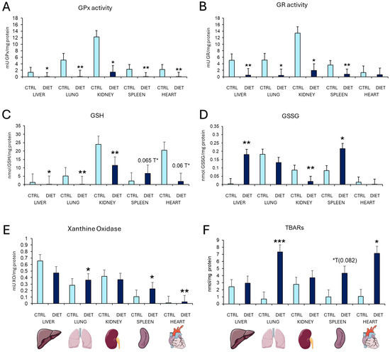 Oxidative state parameters in several organs: liver, lung, kidney, spleen, and heart. (A) Glutathione peroxidase (GPx) activity in mU/mg protein, (B) Glutathione reductase (GR) activity in mU/mg protein, (C) Glutathione reduced (GSH) in nmol/mg protein, (D) Glutathione oxidized (GSSG) in nmol/mg protein, (E) Xanthine oxidase activity in mU/mg protein, and (F) TBARS concentration in nmol/mg protein. Each column shows as mean ± standard deviation. The statistical analysis used was the t-student *: p < 0.05; **: p < 0.01 and *** p < 0.001 concerning the values obtained in the control group. *T: statistical trend.