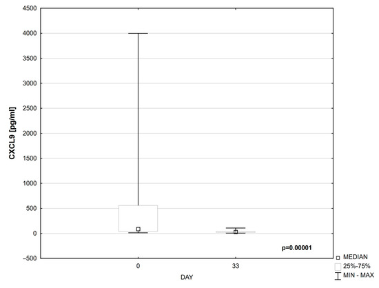 Compared to day 0, a statistically significant decrease in the levels of CXCL-9 (p = 0.00001) and CXCL-10 (p = 0.00010) was observed in the serum of patients on day 33 of treatment (Table 4, Figure 1 and Figure 2).
