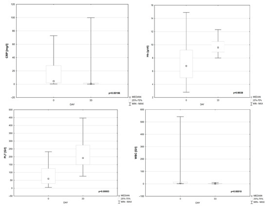 The significant changes in CRP, Hgb, PLT, and WBC on days 0 and 33 of treatment were observed (Table 4, Figure 3).