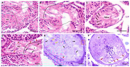 Light microscopy. Terminal segment of the hamster seminiferous tubule. (A) Seminiferous tubule with normal spermatogenesis (NST), followed below by the first subpart (between the dotted lines) in which the epithelium progressively loses spermatogenesis; hematoxylin and eosin staining (H&E). (B) Subpart with only modified SCs and a final zone of modified SCs that form a plug or valve (between continuous and dotted lines); H&E. (C) Modified SCs (arrows) in the plug or valve; H&E. (D) Receptacle or the initial part of the straight tubule (IPST). The continuous line demarcates the end of the SC valve (SV) with modified SCs (black arrows). The IPST exhibits a flattened epithelium (arrows red). Valve (V); H&E. (E,F) Semithin sections stained with Toluidine blue. (E) Some spermatogonia (red arrow) and spermatocytes (yellow arrows) are found in the TS epithelium. SCs: black arrows. The peritubular interstitium shows several layers of myoid cells (red square). (F) Clearly shows the valve plug (V). Flatted cells of the IPST epithelium (red arrows) and IPST lumen (asterisks). Scale bar = 25 µm. From [,].