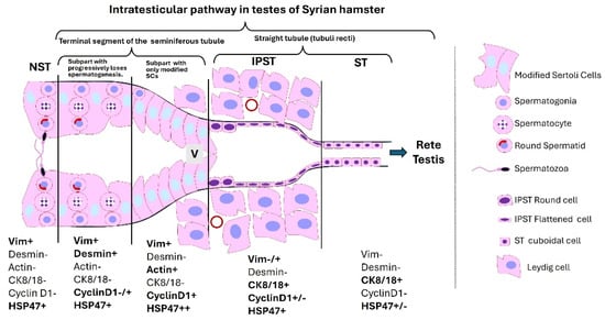 In the hamster—a widely used animal model in reproductive biology—our research group verified some of the aforementioned results (Figure 1) [,]. We also obtained new information regarding the modified SCs of the TS by studying other cytoplasmic markers, particularly those linked to the cytoskeleton and cell proliferation (Figure 2 summarizes the results). In the Syrian hamster, we observed varying positivity in the expression of different cytoplasmic filaments, such as vimentin, desmin, and actin (Figure 2 and Figure 3).