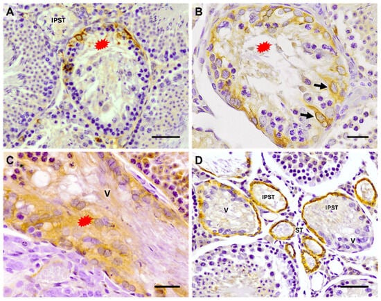Light immunohistochemistry detection of desmin, actin, and cytokeratin 8/18 in the hamster TS and ST. (A) Desmin-positive SCs are only located in the initial subpart of the TS (red asterisk), where the epithelium progressively loses spermatogenesis. In the initial part of the straight tubule (IPST) and seminiferous tubules, in which spermatogenesis is complete, SCs are desmin-negative. (B) Transversal section of the initial subpart of the TS (red asterisk). Arrows: desmin-positive SCs. (C) The cytoplasm of modified SCs in the valve (V) is highly positive for actin (red asterisk). (D) Immunoreactivity to cytokeratin 8/18 is found in the epithelium of the IPST and ST. The modified SCs of the valve (V) are cytokeratin 8/18-negative. Scale bar = 25 µm. From [,].