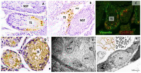 (A,B) Cyclin D1 immunohistochemistry. Most modified Sertoli cells (SCs) of the TS are Cyclin D1-positive, as are some from the initial part of the straight tubule (IPST). In normal spermatogenesis (NST), positive SCs are not observed. (C) In this double-stained confocal microscopy image, D1-positive cells are also vimentin-positive. (D) Modified SCs of the TS are strongly positive for HSP47. (E) Low-magnification electronography of modified SCs (mSC) with transmission electron microscopy (TEM). Indentations are seen in some nuclei, whereas others are more spherical. (F) Electrolucid cells (ELC) are observed with TEM in the ST and RT. Insert: These cells show proliferation and are positive for proliferating cell nuclear antigen (PCNA) (red arrows). Scale bar: (A–C) = 50 µm; (D) = 25 µm; (F) (light microscopy) = 50 µm; (E,F) = 5 µm. From [,].