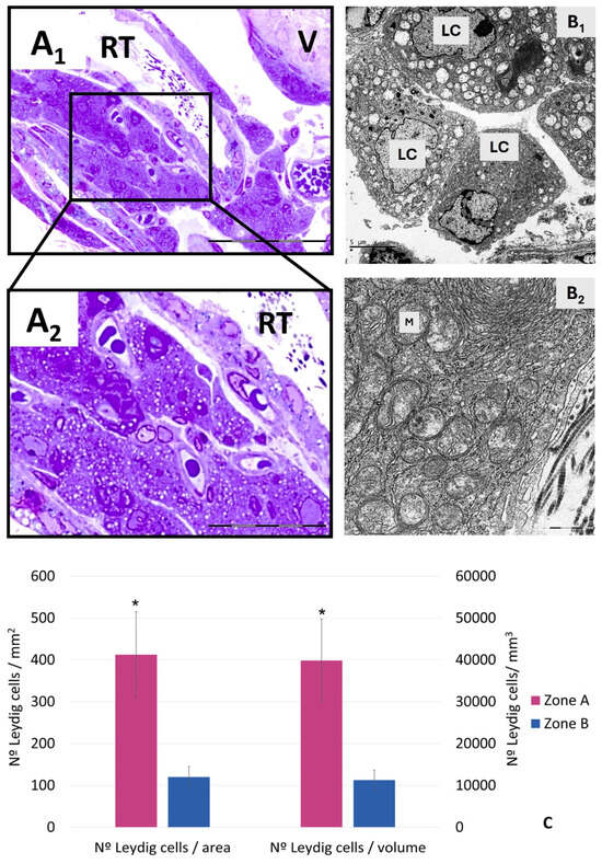 (A1,A2) Light microscopy of semithin sections. Hamster intratesticular pathway interstitium. (A1) shows a large group of Leydig cells can be seen in this interstitium. (A2) shows them close to blood capillaries. RT: rete testis. V: valve. (B1,B2) Transmission electron microscopy. A group of Leydig cells can be seen. LC: Leydig cells. (B2) is at higher magnification and it is easy to identify large mitochondria (M) as abundant rough and smooth endoplasmic reticula in the cytoplasm. Scale bar: A1 = 50 µm; A2 = 25 µm; B1,B2 = 5 µm. (C) Number of Leydig cells by area (mm2) and volume (mm3) in zone A (TS) and zone B (remaining testis). Results are expressed as mean ± SD (n = 12 per group). Significantly different results (p < 0.05) are expressed as: *—relative to the Zone B group. From [].