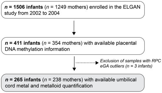 The ELGAN cohort is a unique resource based on its rich -OMICs data including placental DNA methylation, allowing for the estimation of placental epigenetic gestational age, as well as its assessment of fetal exposure to metals using umbilical cord tissue. Placental and umbilical cord tissue samples were collected following birth and stored for future analyses. Specifically, CpG analysis and the measurement of metals in umbilical cord samples were assessed after 2015. Placental DNA methylation quantification was performed on samples from participants who remained enrolled in the study by age 10 and who had available placental tissue of sufficient quality, limiting the sample to 411 infants from 354 mothers. Among these participants, 268 infants (241 mothers) also had umbilical cord tissue that underwent assessment for select essential and non-essential trace elements. Following the exclusion of potential outliers as further discussed below, the final analytic sample consisted of 265 infants from 238 mothers (Figure 1).