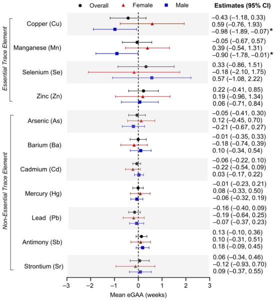 Linear mixed modeling was used to evaluate the relationship between prenatal exposure to each of the 11 metals of interest and placental eGAA (Figure 2). Adjusting for the aforementioned covariates, we did not observe significant associations between individual exposures to any of the metals and eGAA in the overall sample. When stratified by infant sex, no significant associations were found in female infants. However, umbilical cord Cu concentration was associated with an average eGA deceleration of −0.98 weeks of gestation (95% CI: −1.89, −0.07) in male infants. Additionally, prenatal exposure to Mn exhibited a male-specific association with eGA deceleration (adjusted β: −0.90 weeks of gestation; 95% CI: −1.78, −0.01).